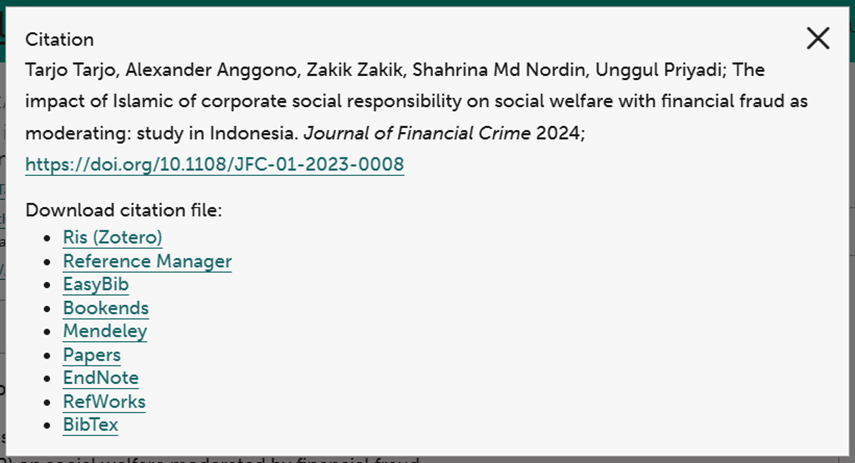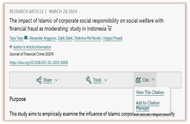 - Click the “Cite” dropdown on the article homepage.